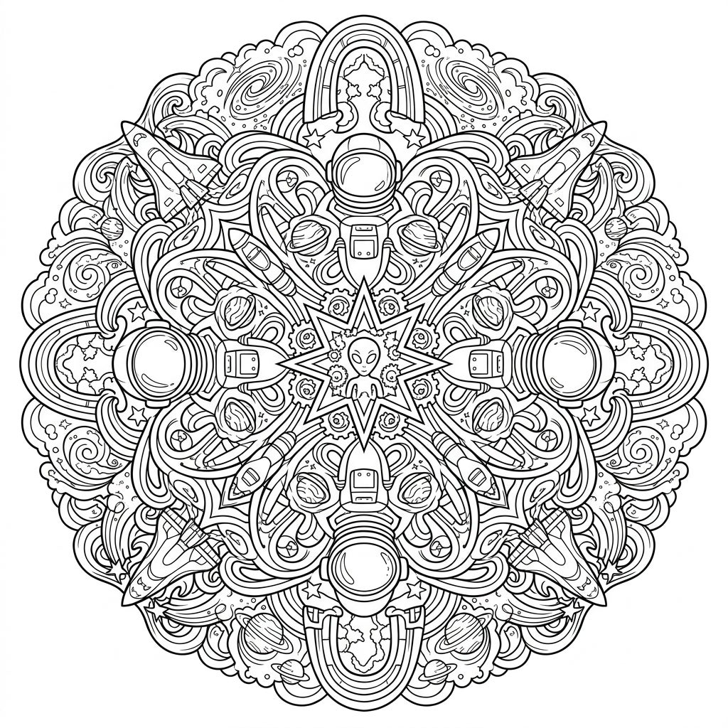 To bring this cosmic vision to life, consider using a palette that evokes the vastness of space – deep blues, purples, and shimmering silvers for the background, contrasted with bright, neon greens, pinks, and yellows for the psychedelic swirls and futuristic elements. Experiment with gradients to create depth on the planets or in the trailing smoke of rockets. Whether you prefer markers, colored pencils, or gel pens, this mandala provides the perfect canvas to practice shading, blending, and intricate detail work, promising hours of relaxing and stimulating creative fun.