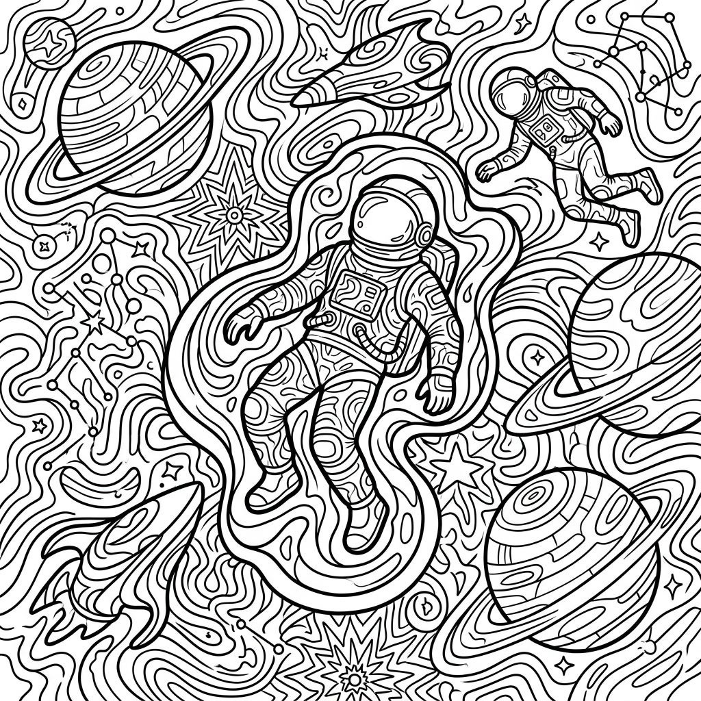 Unleash your creativity with this mesmerizing psychedelic space coloring page, designed for adults. Immerse yourself in a universe of swirling lines, astronauts, planets, and futuristic designs.