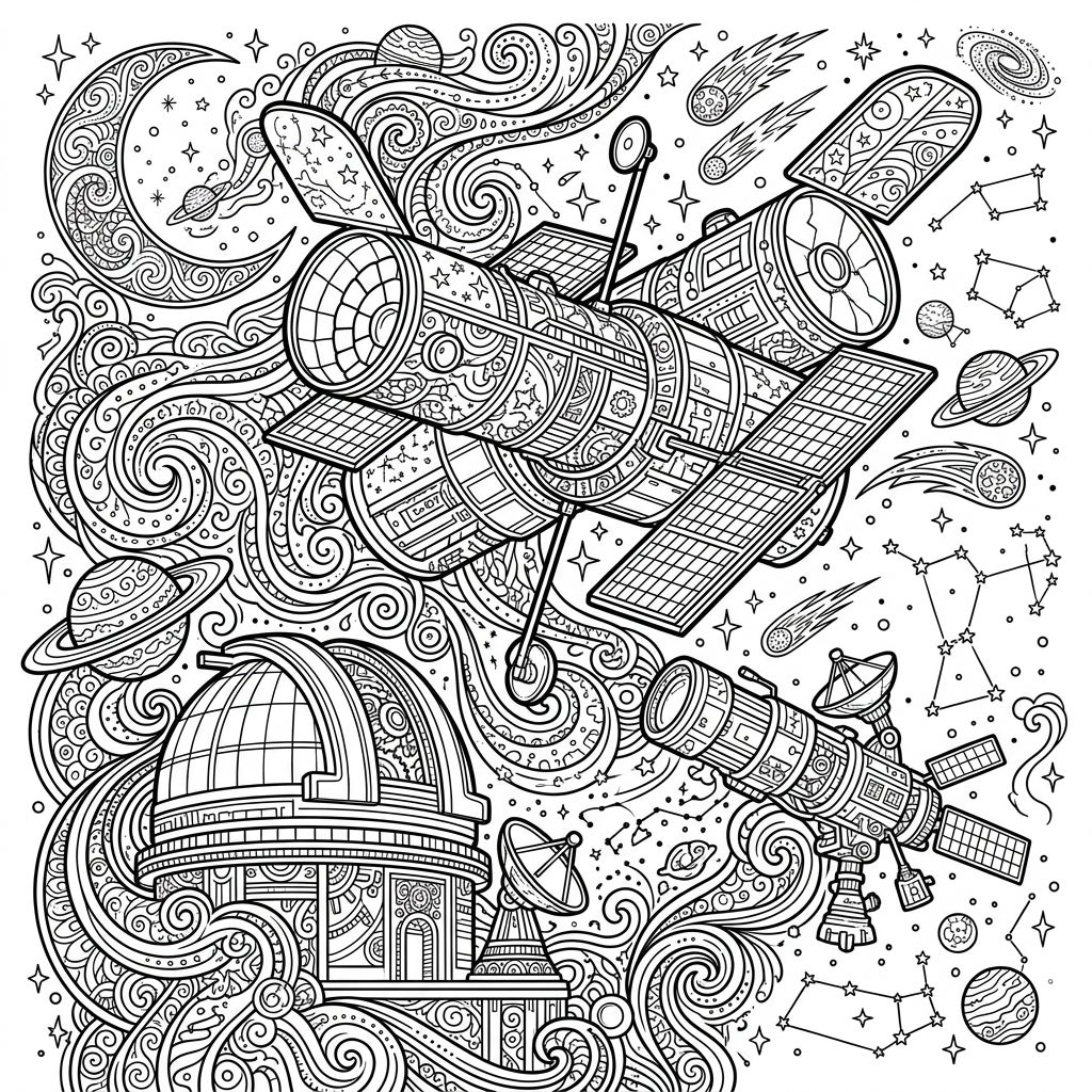 Unleash your inner astronaut with this captivating adult coloring page, showcasing majestic space telescopes and the wonders of the universe. Dive into a world of intricate cosmic patterns, perfect for mindful relaxation and creative expression.