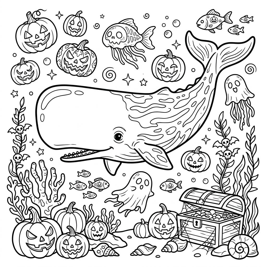 Journey beneath the waves to a unique Halloween celebration with our captivating Sperm Whale coloring page! This delightful illustration brings together the majesty of the deep ocean with the playful spirit of October 31st. A large, friendly sperm whale takes center stage, its massive head and gentle smile inviting you into an undersea world bustling with spooky surprises. Surrounding our colossal friend are dozens of intricately carved jack-o'-lanterns, each with its own mischievous grin, along with ethereal ghost fish, bobbing jellyfish-like spirits, and even a friendly sheet ghost drifting through the water. This full-page artwork is teeming with engaging details just waiting for your artistic flair.