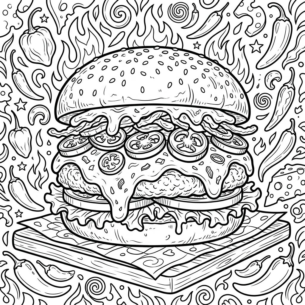 Get ready to bring the heat to life with this deliciously detailed Spicy Jalapeño Burger coloring page. Featuring a mouth-watering burger overflowing with melted cheese and fiery peppers, it's a perfect challenge for creative colorists.