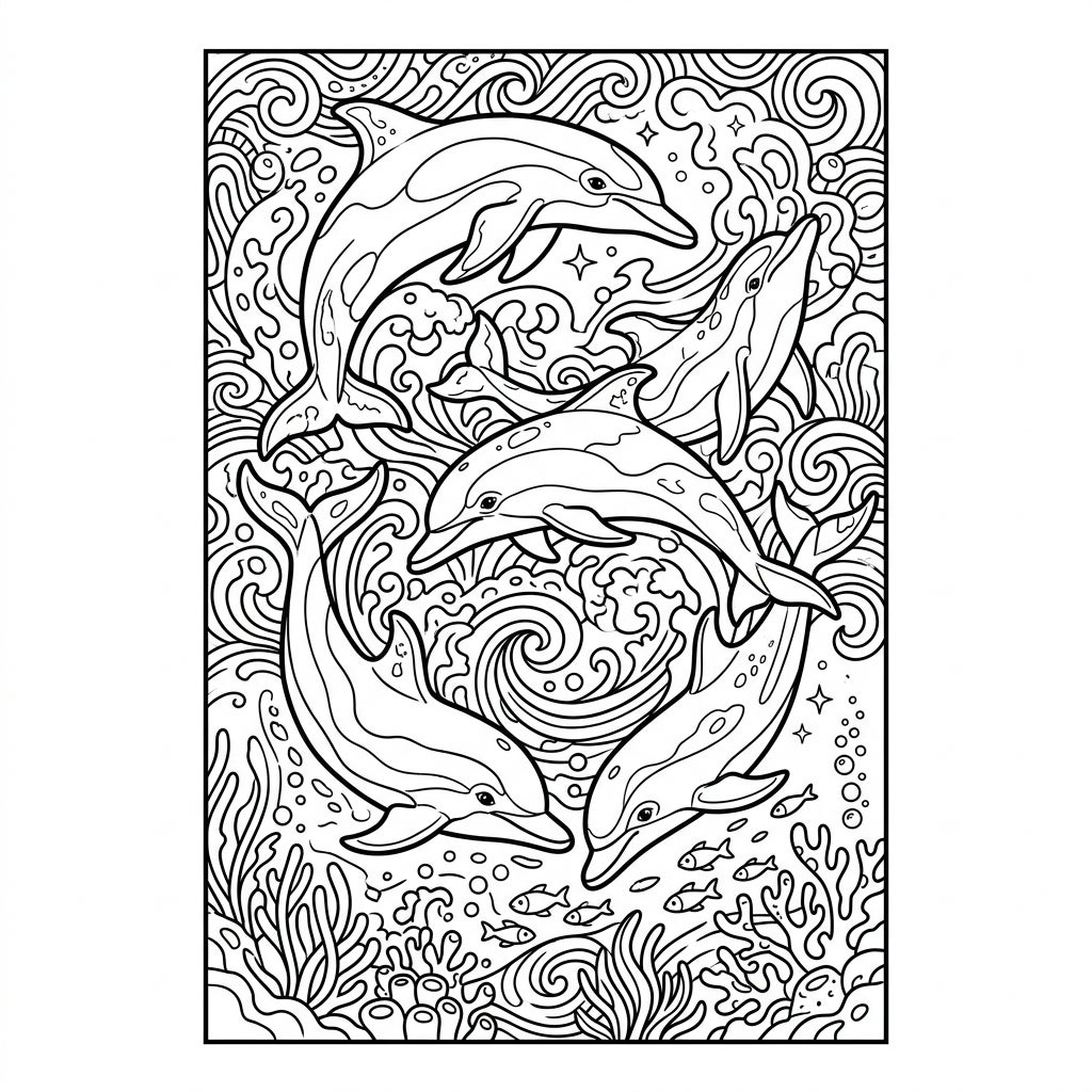 Dive into a breathtaking underwater world with our Spinner Dolphins Bookmark coloring template. This dynamic illustration captures a lively pod of spinner dolphins, famous for their acrobatic leaps and playful nature, as they swim and jump through intricate ocean waves. The scene is rich with detail, featuring swirling water patterns, delicate bubbles, curious small fish, and a vibrant underwater garden of coral and stylized seaweed, all meticulously designed to provide an immersive coloring experience.