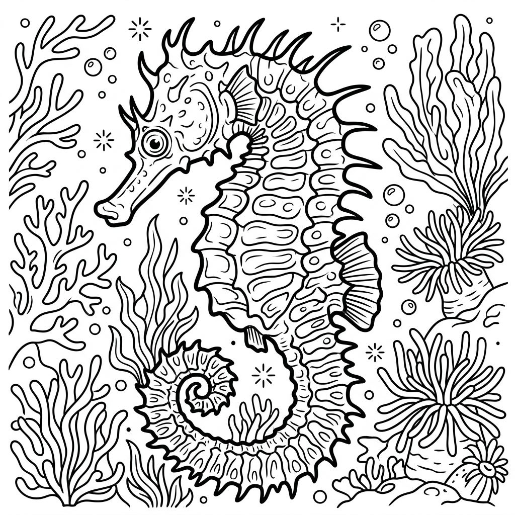 Immerse yourself in the intricate beauty of the ocean with our Spiny Seahorse coloring page. This stunning illustration captures the distinct characteristics of a spiny seahorse, showcasing its unique spine-like projections and textured body in remarkable detail. The central seahorse is gracefully framed by a lively underwater scene, complete with diverse coral structures, flowing seaweed, and playful bubbles, inviting a rich and engaging coloring experience across the entire canvas.