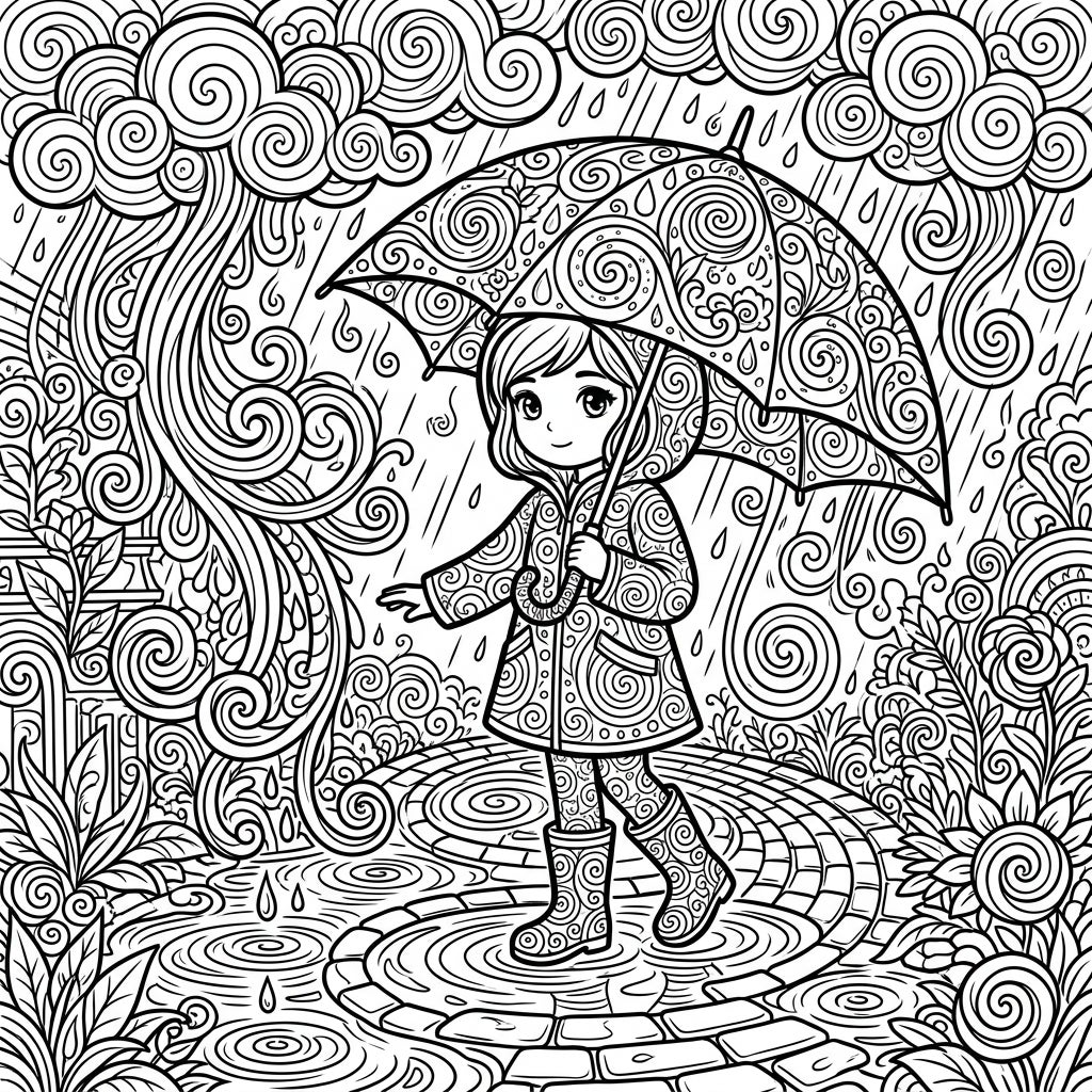 Step into a mesmerizing downpour with this highly detailed coloring page, where a cheerful character, snugly dressed in a patterned rain jacket and boots, gracefully navigates a wet, cobblestone path. Clutching a large umbrella, also adorned with captivating spirals, she is the focal point amidst a richly textured landscape. The scene is alive with falling raindrops, reflective puddles rippling with concentric circles, and an entire background densely filled with swirling clouds, lush foliage, and flowing water effects, all intricately rendered with diverse spiral motifs.