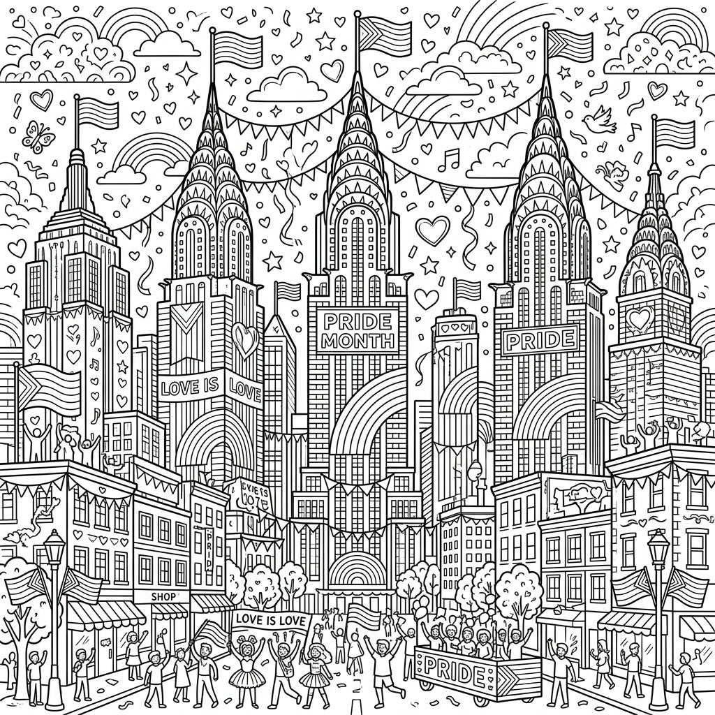 Immerse yourself in a festive city scene where iconic spire skyscrapers light up for Pride Month. This detailed coloring page invites you to celebrate love, diversity, and community with every stroke of color.