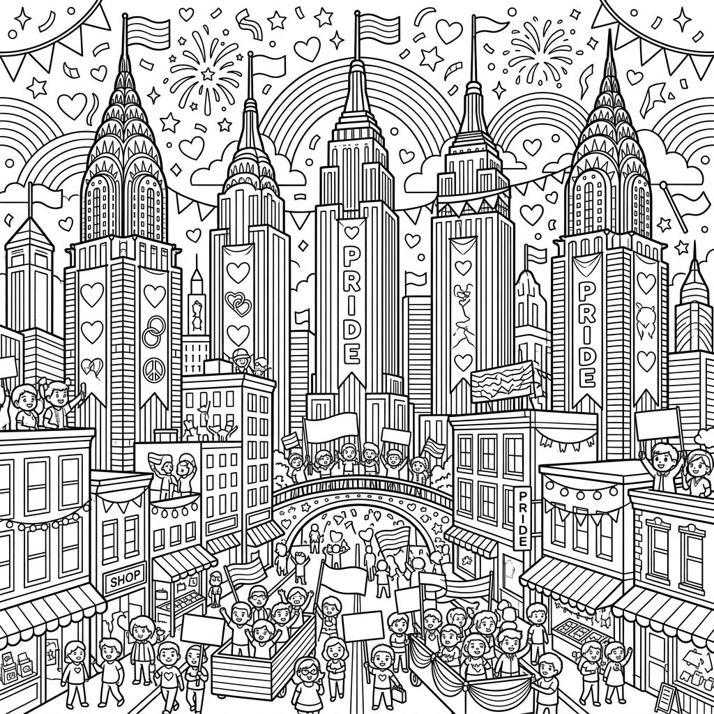Immerse yourself in a spectacular city-wide Pride celebration with this detailed coloring page featuring majestic spire skyscrapers. Adorned with banners and filled with joyful crowds, it's a wonderful way to express love, diversity, and community through art.