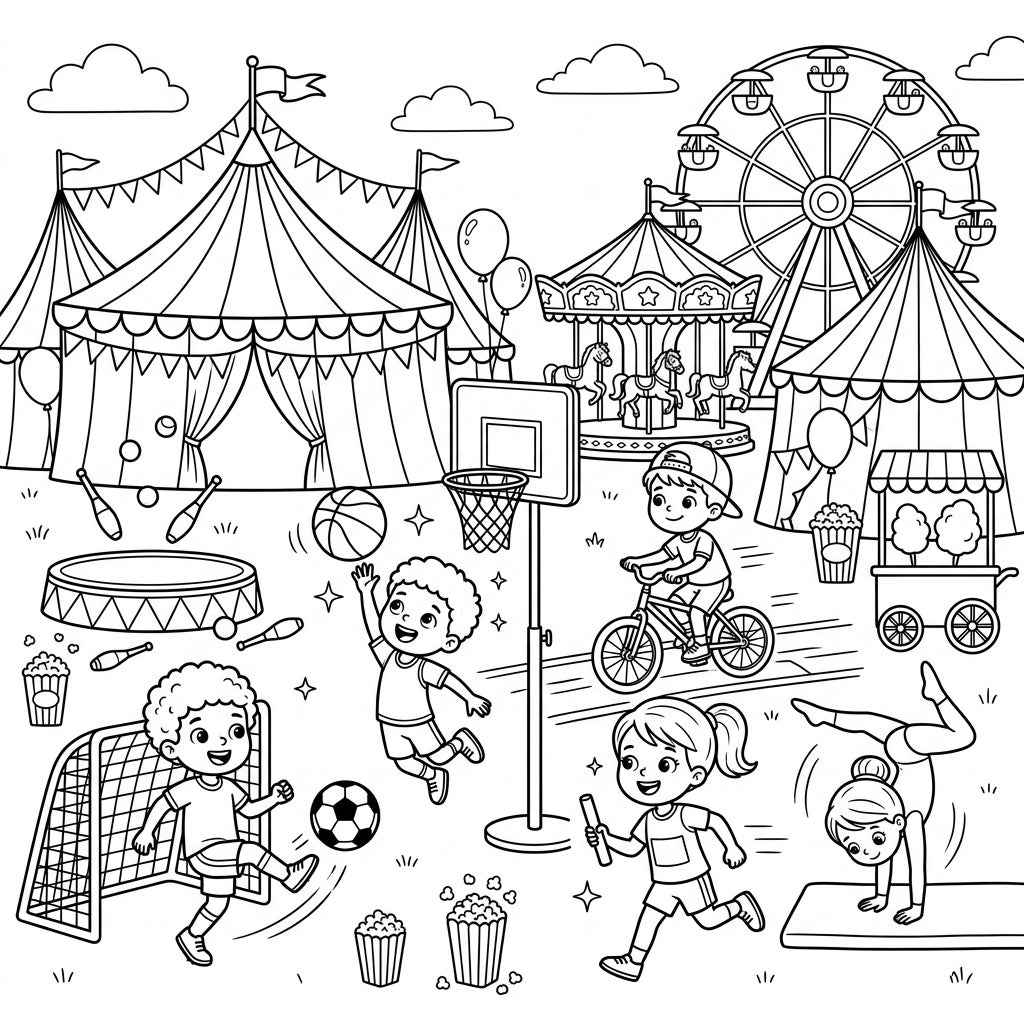 Immerse your child in a bustling carnival atmosphere where sports meet festive fun! This engaging coloring page showcases a vibrant scene filled with young athletes. You'll find a boy expertly dribbling a soccer ball towards a goal, another reaching for a basketball under a hoop, and a cheerful cyclist pedaling past. A determined runner carries a baton, while a flexible gymnast performs an impressive handstand on a mat. All these exciting activities unfold against a backdrop of whimsical circus tents, a grand Ferris wheel, and a classic merry-go-round, alongside delightful popcorn and cotton candy stands.