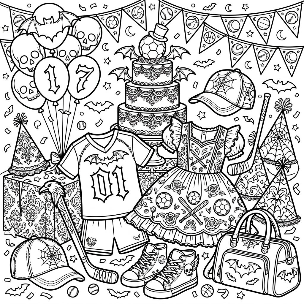 Step into a world where athletic spirit meets dark elegance with this intricate coloring template. The scene is brimming with fascinating details, including a grand tiered cake adorned with delicate lace patterns and a soccer ball topped with bat wings. Surrounding it, balloons featuring spooky skulls and the bold number 17 float alongside festive party hats detailed with intricate spiderwebs. You'll find a full sports uniform – a jersey boasting a bat emblem and matching shorts – paired with a uniquely styled dress featuring athletic motifs like soccer balls and baseball bats, all within a gothic aesthetic.
