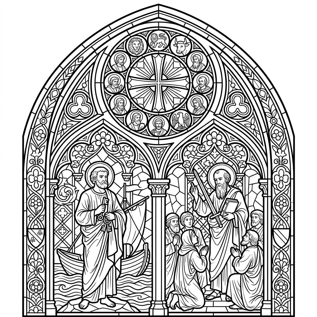 This magnificent coloring template invites you to explore the beauty of a traditional Gothic stained glass window. The intricate design features a grand arched framework, typical of cathedral art, filled with detailed scenes. On the left, Saint Peter stands by a fishing boat, holding his symbolic keys, while on the right, another prominent saint, possibly Saint Paul, is depicted with a sword and a book, ministering to a group of kneeling figures. These central panels are surrounded by exquisite architectural elements and floral motifs, offering a captivating visual narrative.