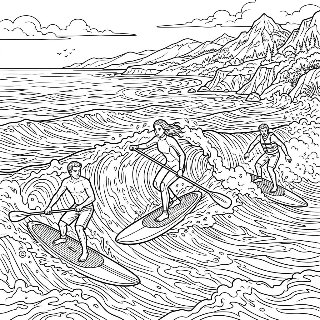 Experience the thrill of the ocean with this dynamic Stand Up Paddle Surfers coloring page. Capture the energy of riders catching waves against a stunning backdrop of mountains and sea.