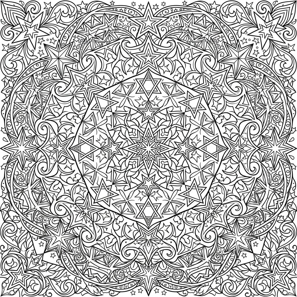 Embark on a celestial coloring adventure with this extraordinarily detailed star geometric mandala. This captivating design is a symphony of stellar shapes, prominently featuring an array of five-pointed, six-pointed, and multi-pointed stars that interweave and expand from its radiant core. The entire square frame is meticulously filled with intricate linear patterns and graceful swirls, creating a sense of profound depth and endless discovery as you explore each segment.