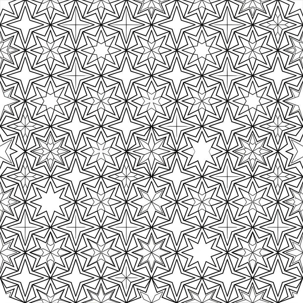 Unleash your creativity on this stellar design! Consider using a limited palette of harmonious colors to bring out the intricate layering of the stars, or experiment with contrasting hues to highlight individual shapes. You could color alternating stars in different shades, or create a gradient effect across sections of the tessellation. Don't forget to play with light and shadow within each star to add depth and make your finished masterpiece truly shine. Enjoy the process of transforming this black-and-white canvas into a vibrant work of art!
