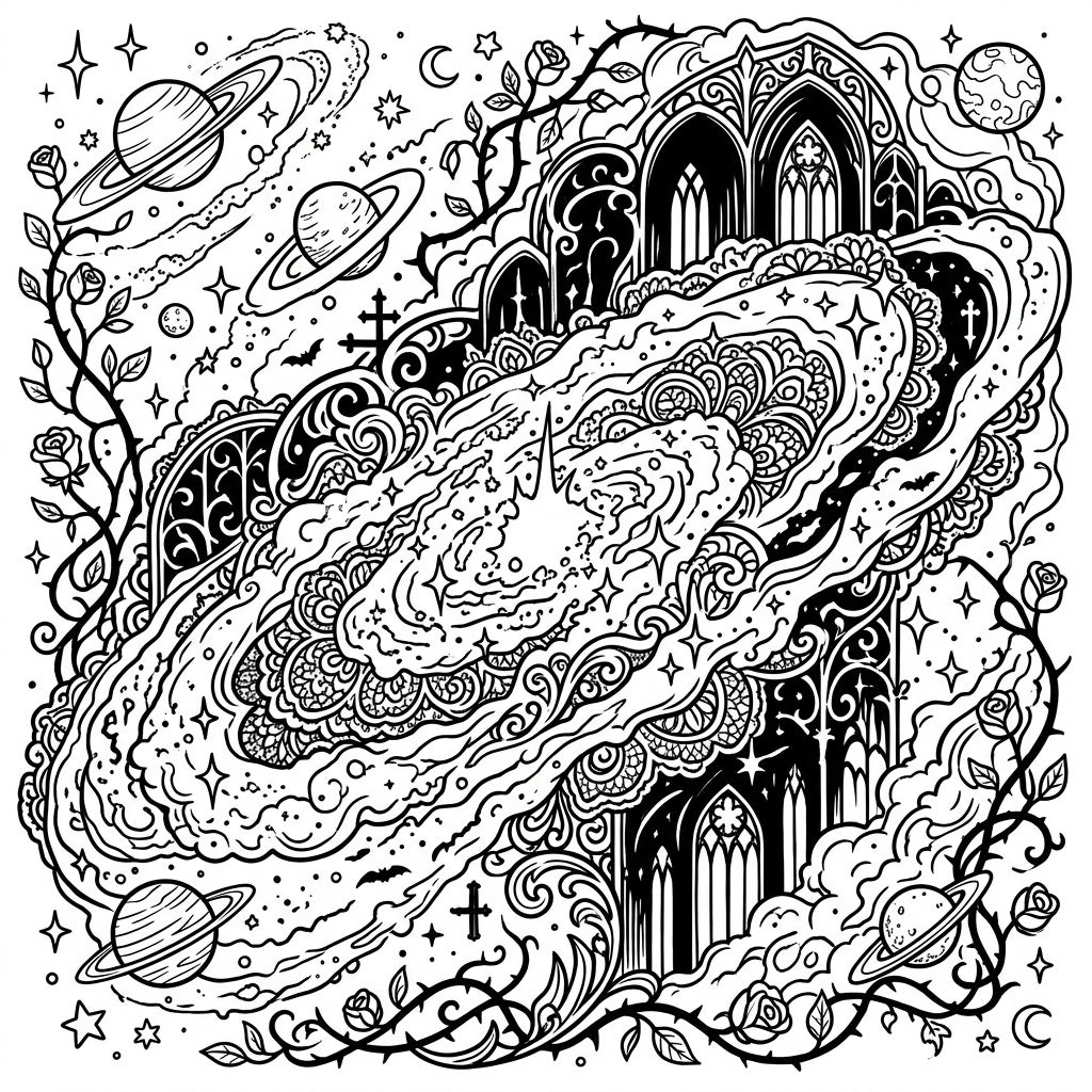 Unleash your creativity with this mesmerizing coloring page featuring a dramatic starburst galaxy intertwined with intricate gothic architecture and thorny rose vines. This unique design offers a cosmic journey through darkness and beauty, perfect for a relaxing artistic escape.