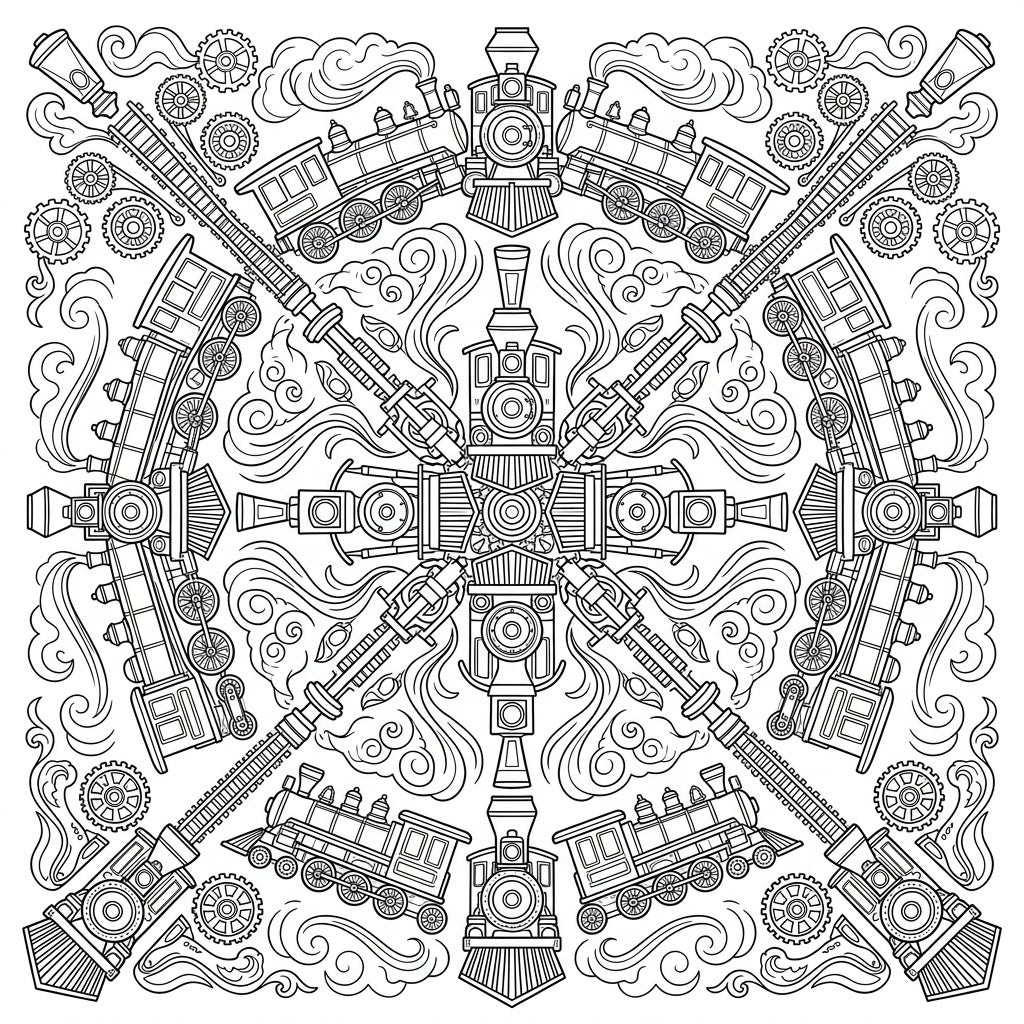Dive into the fascinating world where classic steam trains meet intricate mandala artistry. This exceptional coloring page showcases multiple iconic steam locomotives, complete with their tenders, smokestacks, and impressive wheel mechanisms, all meticulously arranged in a perfectly symmetrical radial pattern. Swirling steam effects and decorative gears fill the spaces, creating a dynamic yet balanced composition that invites a close look at every detail.