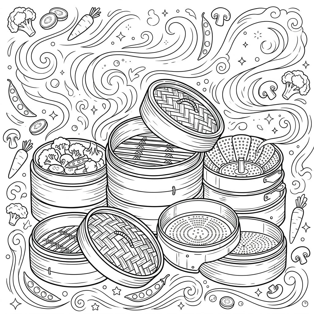 Dive into the delightful details of healthy cooking with this unique coloring page featuring an array of steamer inserts and baskets. Discover the intricate patterns and fresh vegetables awaiting your creative touch, perfect for food enthusiasts of all ages.