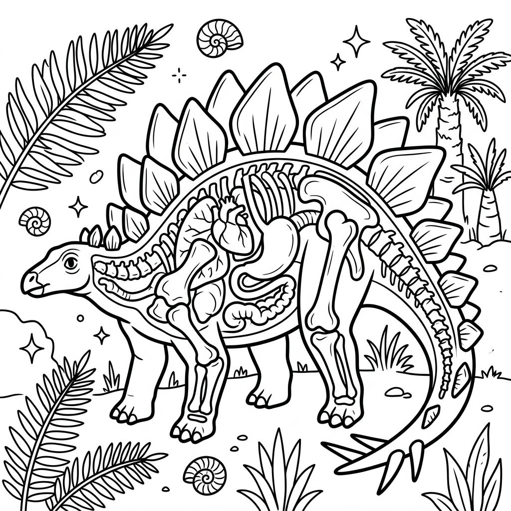Dive into a prehistoric adventure with our unique Stegosaurus anatomy coloring page! This captivating illustration features a magnificent Stegosaurus, with its distinctive plates and thagomizer tail, presented in a clear, easy-to-understand anatomical view. Young artists can explore the dinosaur's skeleton, heart, and other internal organs, all outlined with balanced lines perfect for little hands. The scene is brought to life with charming prehistoric flora like ferns and palm trees, along with scattered spiral shells and twinkling stars, creating a rich and engaging environment.
