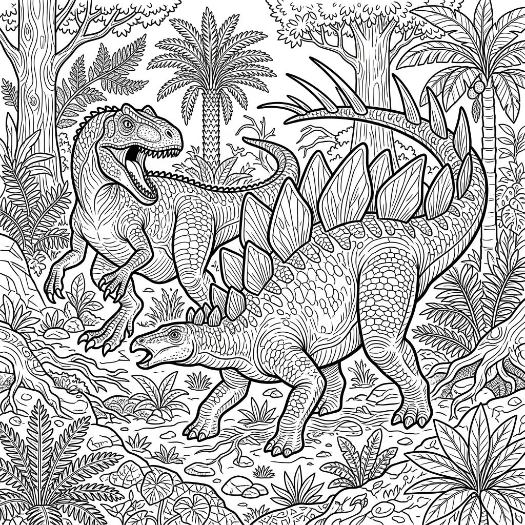 Journey back in time with this captivating coloring template, showcasing a fierce encounter between a magnificent Stegosaurus and a powerful carnivorous dinosaur. Every detail, from the Stegosaurus's iconic plates and thagomizer tail spikes to the predator's sharp teeth and scales, is meticulously outlined for an immersive experience. The lush, intricate jungle background, filled with ancient ferns, towering palm trees, and gnarled roots, creates a truly dynamic prehistoric scene ready for your artistic touch.