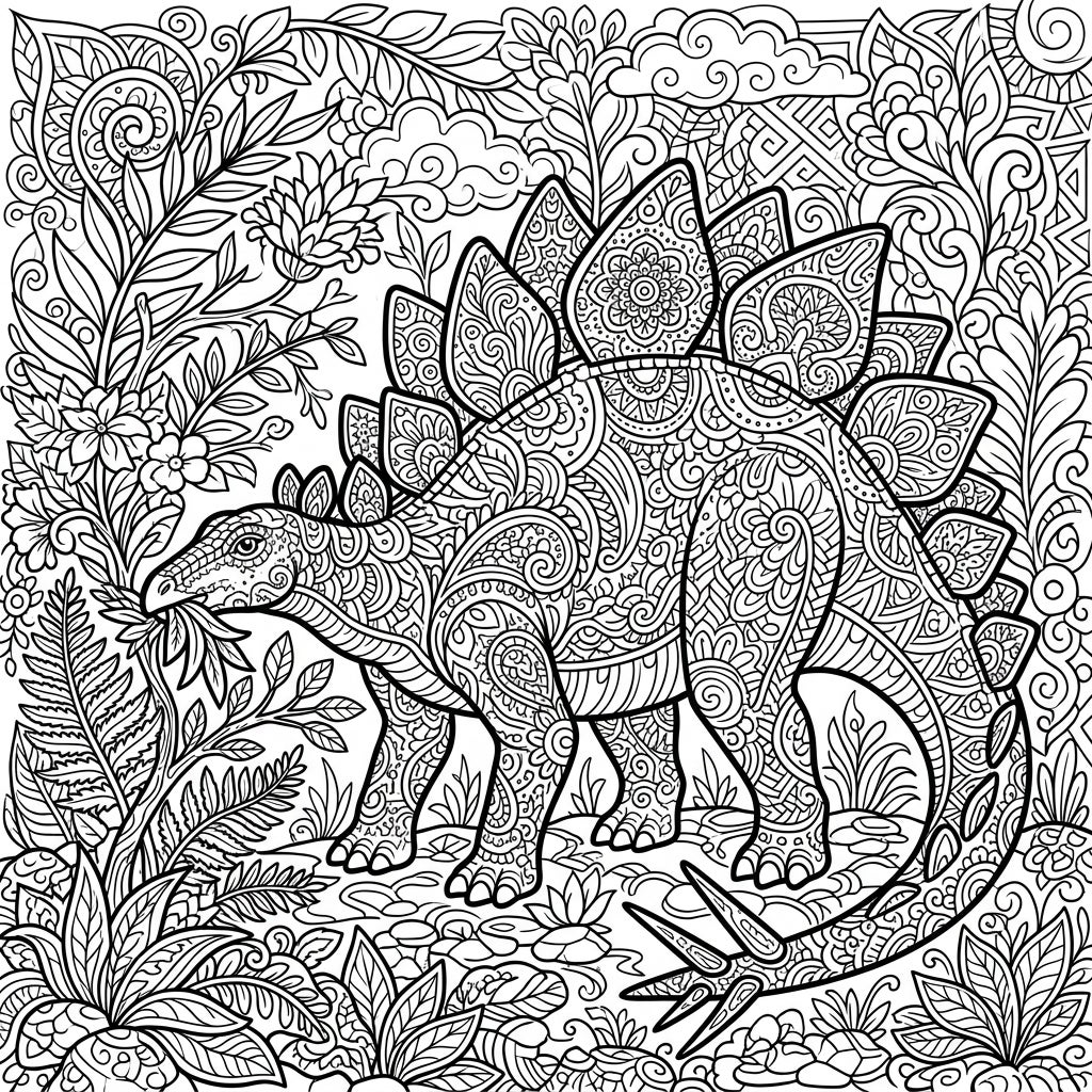 Beyond just a dinosaur scene, this template invites you into a state of meditative focus, reflecting the tranquil act of the Stegosaurus's herbivorous diet within a serene, patterned landscape. The high density of abstract lines and repetitive motifs inherent in the Zentangle style encourages mindfulness and relaxation, allowing you to unwind as you bring color to each tiny section. It's an artistic escape that blends historical fascination with therapeutic creativity, perfect for those seeking a calm yet stimulating activity.