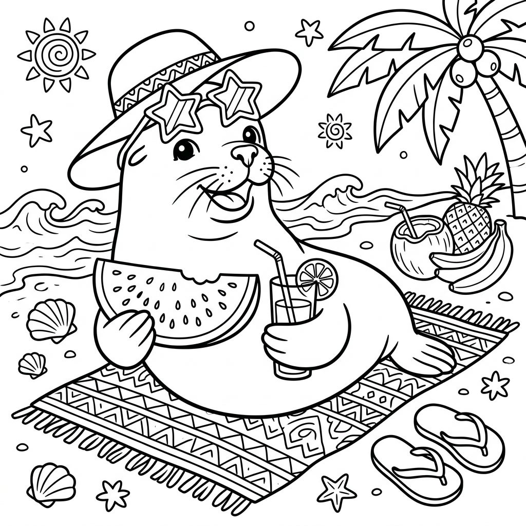 Join a cheerful Steller sea lion enjoying a perfect summer day on the beach. This delightful coloring page features all the best parts of a sunny vacation, from cool drinks to tropical fruits.