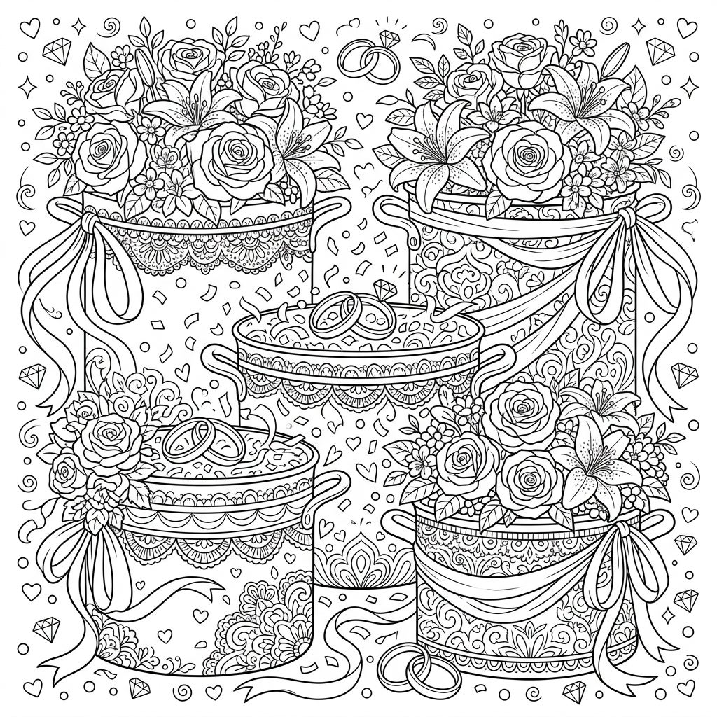 This design beautifully blends the unexpected charm of kitchenware with the romance of a wedding, offering a truly original coloring experience. The intricate internal patterns within the stockpots, combined with the detailed floral arrangements and background elements like hearts, diamonds, and subtle swirls, provide a rich canvas for colorists seeking a deeply engaging and stress-relieving activity. It's an ideal way to relax, focus your mind, and celebrate the joy of a special day through art.