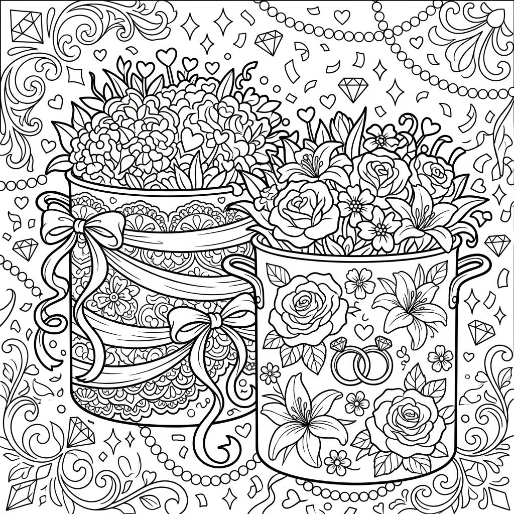 Immerse yourself in a romantic coloring experience with our intricate Wedding Stockpots design. This detailed page, filled with elegant florals and wedding motifs, offers a perfect escape for adults seeking mindful relaxation.