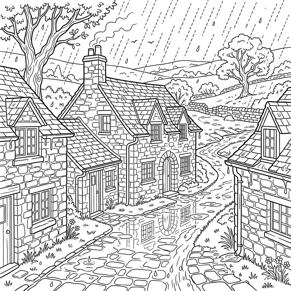 Immerse yourself in the calming atmosphere of a rainy day in a quaint village. This intricate coloring page features charming stone cottages, perfect for bringing a peaceful scene to life.