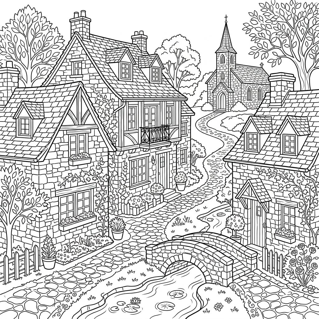 Step into a charming, detailed village scene with this intricate coloring page featuring beautiful stone cottages. Designed especially for teens, it offers a delightful challenge for creative minds.