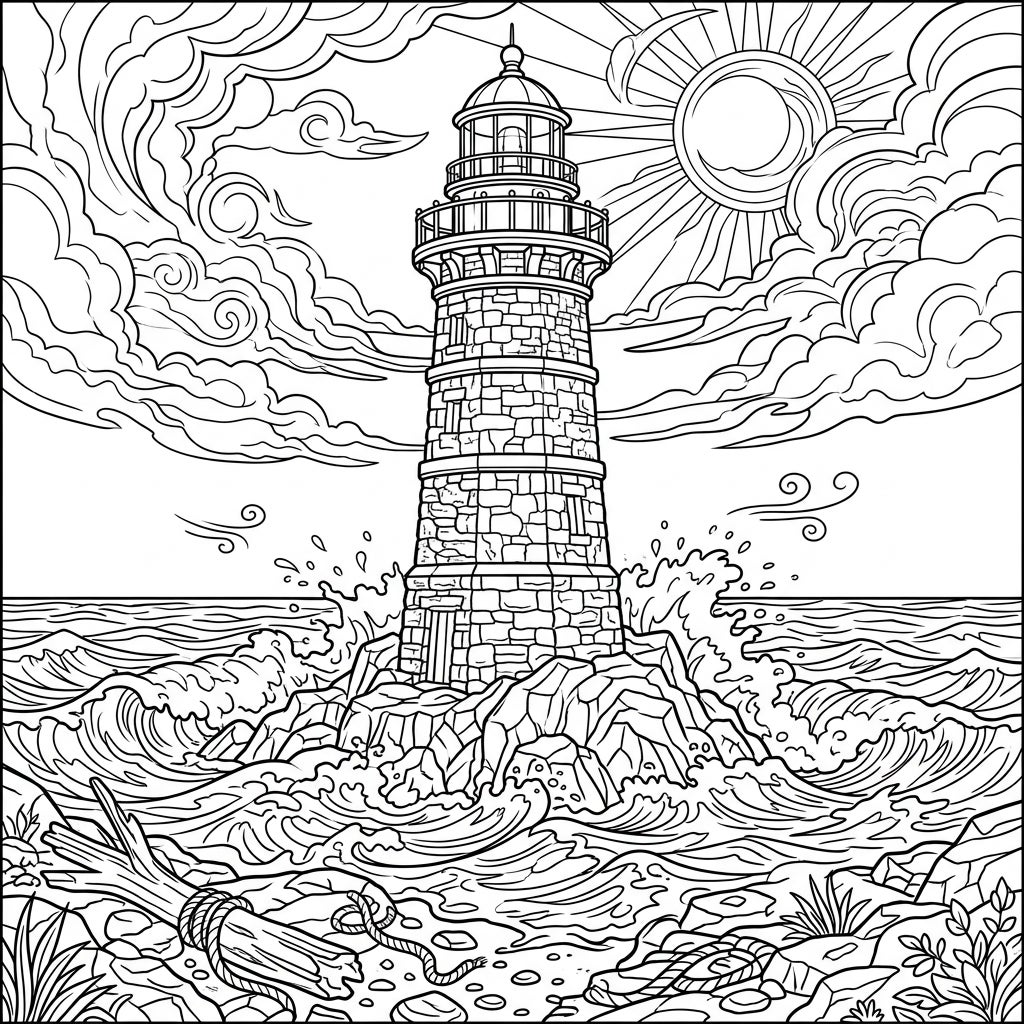 Embark on an artistic journey with this highly detailed coloring page featuring a majestic stone lighthouse, standing resilient against the forces of nature. The intricate rough-hewn and cut stone construction of the lighthouse is rendered with fine line work, inviting you to bring out its texture and depth. Surrounding this stoic guardian, turbulent ocean waves crash against the rocky base, while dramatic, swirling clouds dominate the sky, pierced by the rays of a stylized sun. The foreground adds to the scene with scattered driftwood and rope, creating a truly immersive coastal experience.