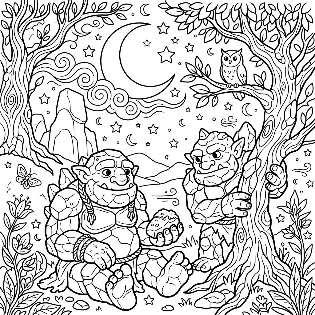 Step into a mystical forest where two magnificent Stone Trolls enjoy a tranquil night under a luminous crescent moon and twinkling stars. This detailed coloring page captures a charming scene, with one troll seated, contemplatively holding a moss-covered item, while its companion stands steadfastly by a sturdy tree, observed by a wise owl. Intricate lines bring to life their rock-like skin, the gnarled bark of ancient trees, and delicate forest flora, inviting you to explore every enchanting detail.
