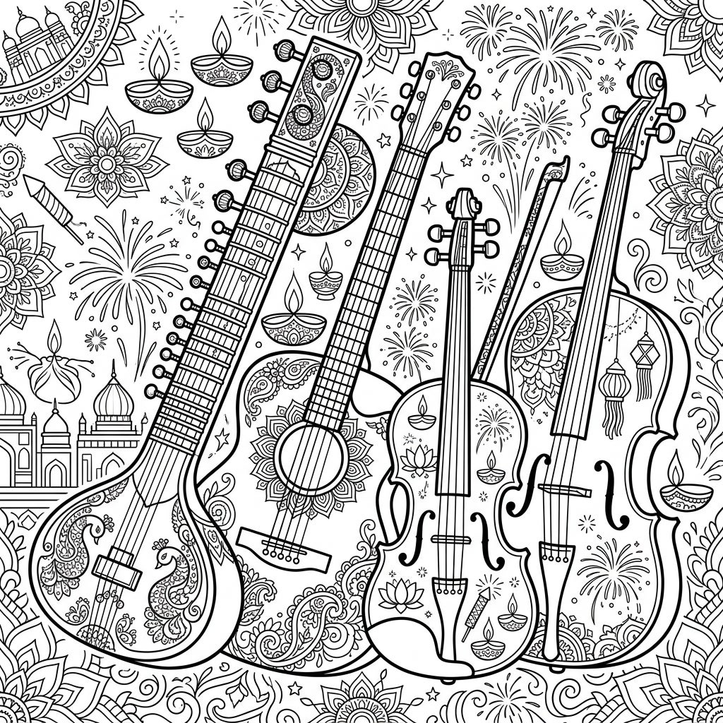 Discover a unique coloring experience featuring an array of string instruments beautifully integrated with Diwali festival motifs. Adorned with diyas, fireworks, and intricate patterns, this page offers a captivating blend of music and celebration.