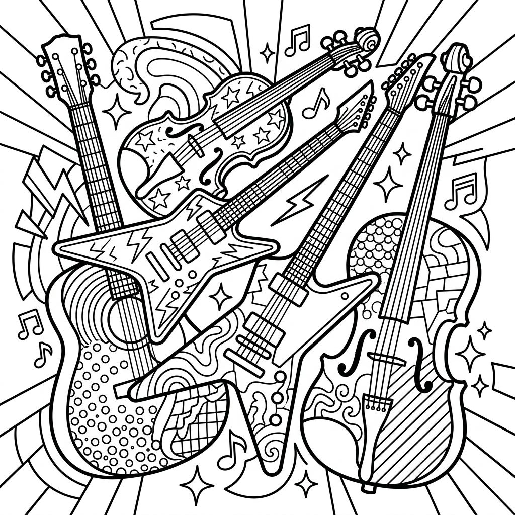 Unleash your inner artist with this dynamic Pop Art coloring page featuring an exciting array of string instruments. From electric guitars to elegant violins, this design captures the energetic spirit of music in a unique style.