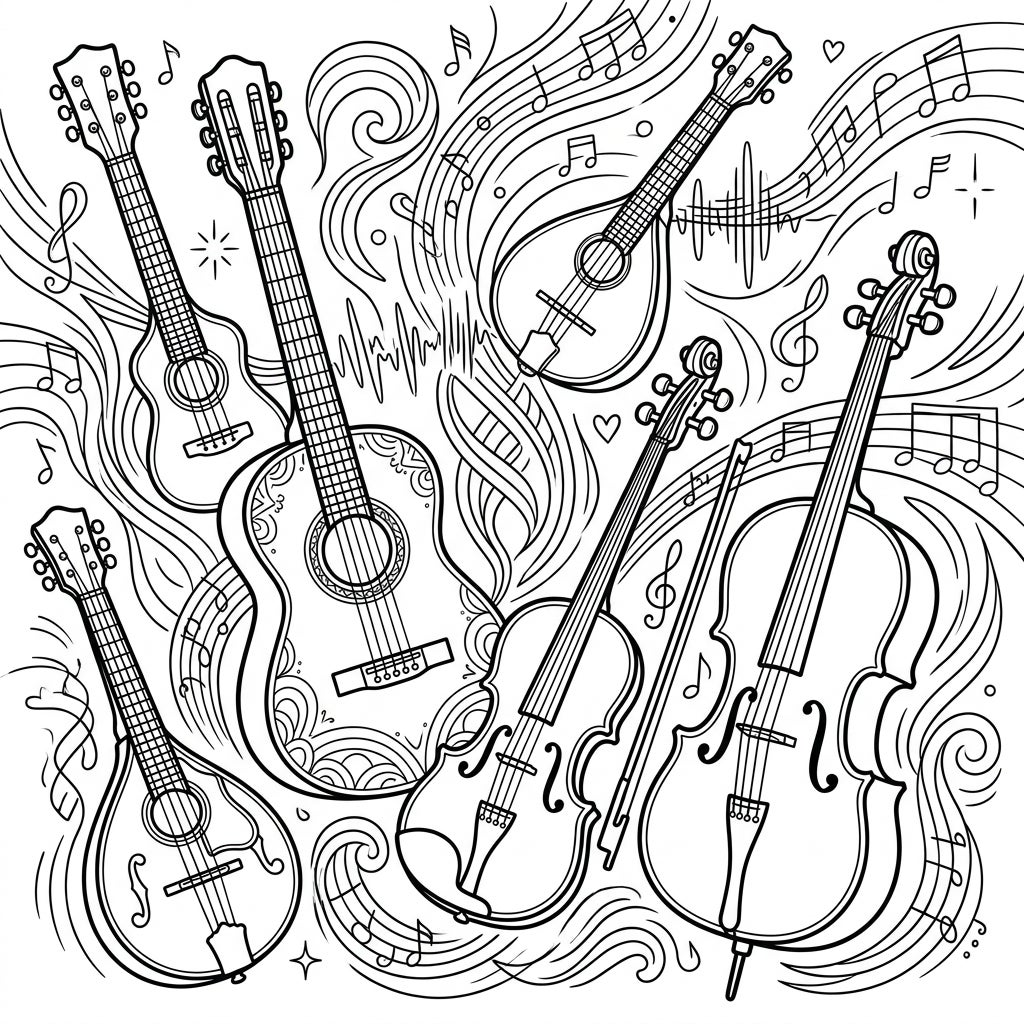 Immerse yourself in the world of music with this captivating coloring page, showcasing a grand ensemble of string instruments. Discover gracefully drawn guitars, elegant violins, majestic cellos, and charming mandolins, each rendered with clear, bold outlines perfect for bringing to life with your favorite colors. The composition is richly adorned with swirling musical notes, treble clefs, and abstract sound wave patterns, creating a dynamic and immersive backdrop for this orchestral display.
