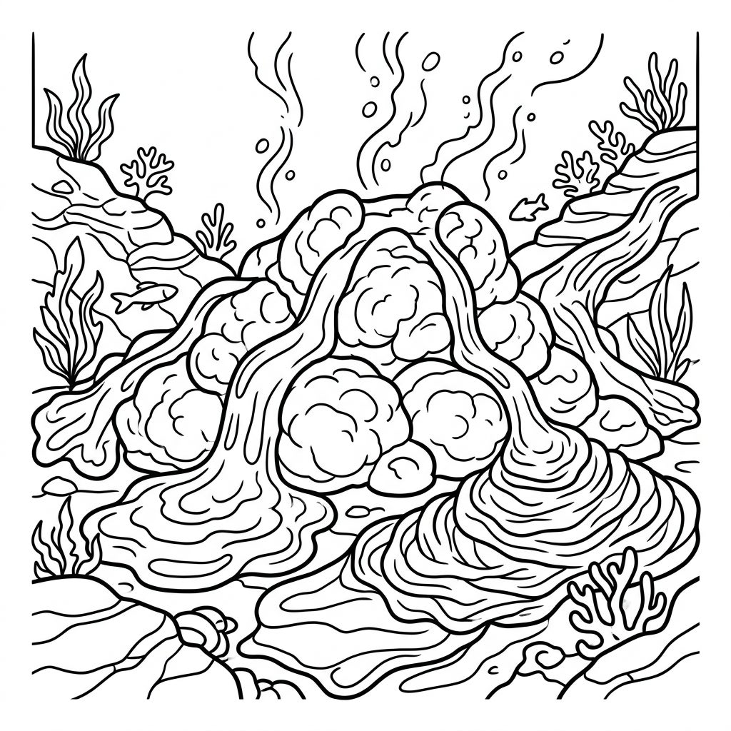 Journey beneath the waves to a spectacular world where fiery lava meets cool ocean waters! This incredible coloring page captures the dramatic beauty of a submarine volcanic eruption, perfect for young explorers. Discover intricate pillow lavas and flowing molten rock as it shapes the ocean floor, surrounded by fascinating underwater landscapes and bubbling activity.