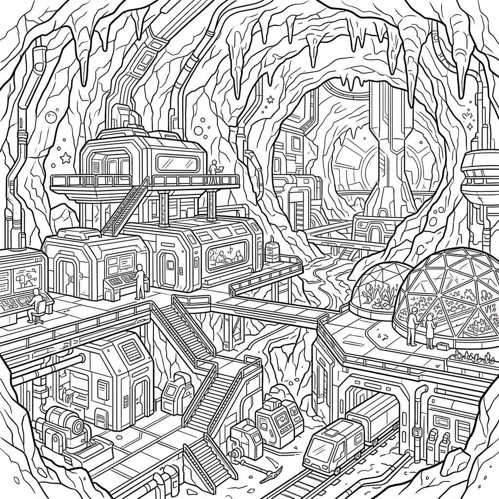 Journey into a fascinating future with this detailed coloring page of a subterranean space habitat. Explore an advanced underground city, complete with intricate architecture and cutting-edge technology, ready for your creative touch.