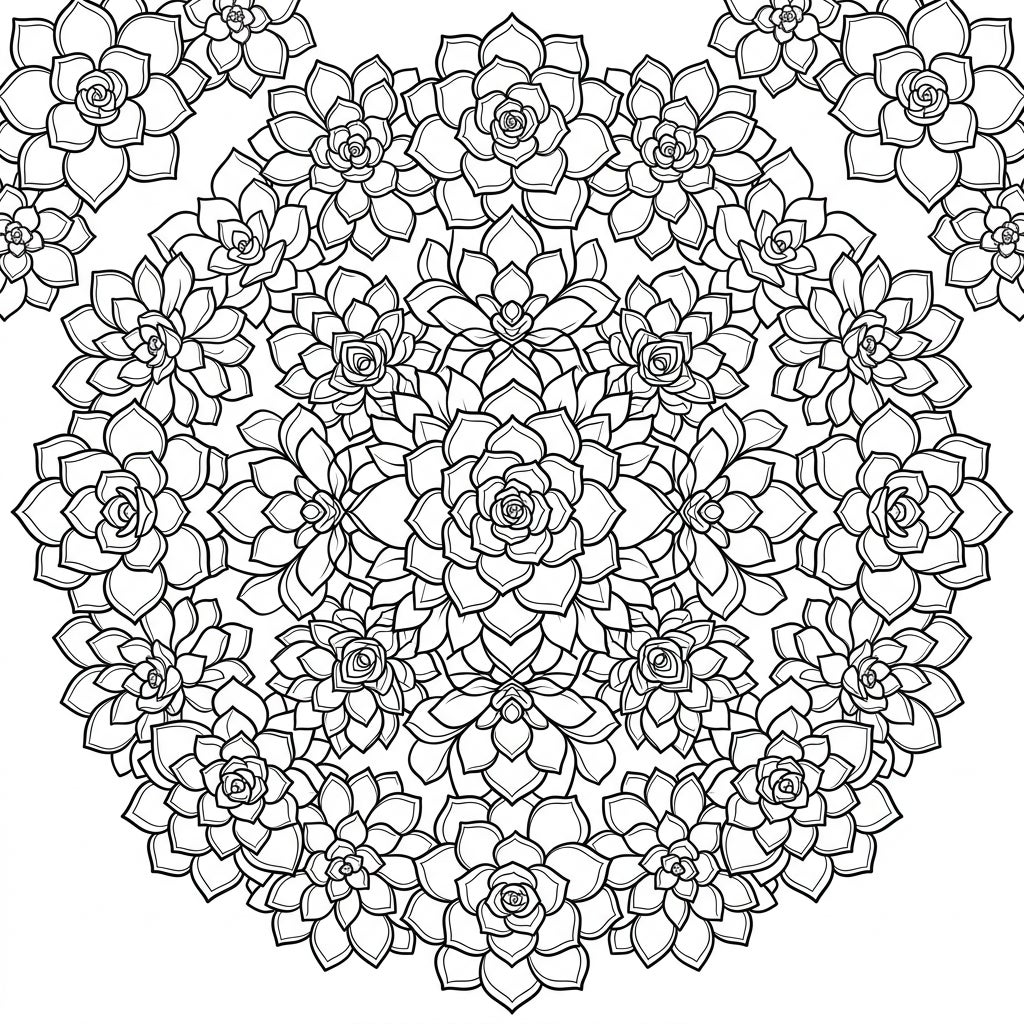 Explore a captivating world of botanical beauty with this unique succulent mandala coloring page. This intricate design showcases a mesmerizing array of succulent plant rosettes, meticulously arranged in a perfect circular mandala formation. Each petal and leaf is outlined with clear, bold lines, inviting young artists to bring this garden of symmetrical patterns to life with their favorite colors.