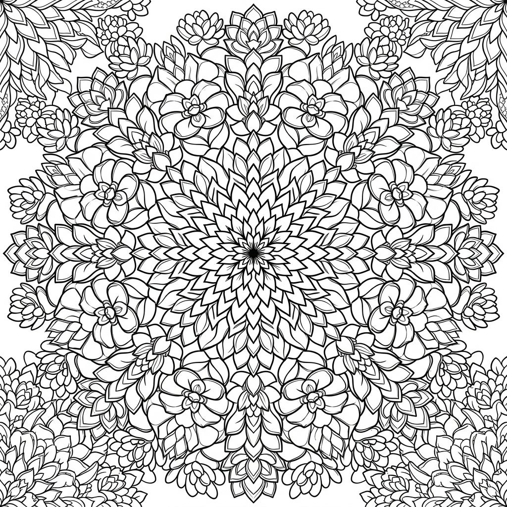 Dive into a world of botanical beauty with this captivating succulent mandala coloring page. This intricate design showcases a mesmerizing array of succulent plant rosettes, meticulously arranged in a perfect radial symmetry. From tightly packed leaves to blossoming forms, every detail has been crafted to create a rich tapestry of natural patterns, completely filling the page for an immersive coloring adventure.