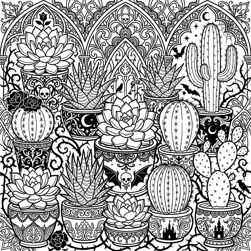 Step into a world where botanical beauty meets gothic mystique with this captivating coloring page. You'll discover a rich assortment of succulents and cacti, each nestled in elaborately designed pots adorned with classic Gothic motifs like crescent moons, tiny castles, and winged skulls. The background weaves a tapestry of ornate architectural arches, reminiscent of ancient cathedrals, alongside thorny vines, delicate roses, and subtle accents like bats and hidden birds, offering an abundance of intricate details to bring to life.