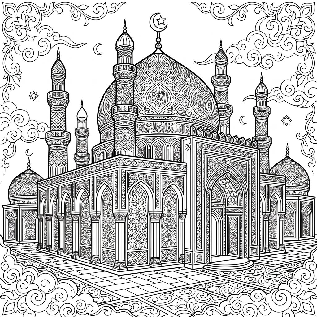 Embark on a mesmerizing artistic journey with this incredibly detailed Sufi Shrine coloring page. Discover the intricate beauty of Islamic architecture, featuring elegant domes, towering minarets, and ornate patterns ready for your creative touch.