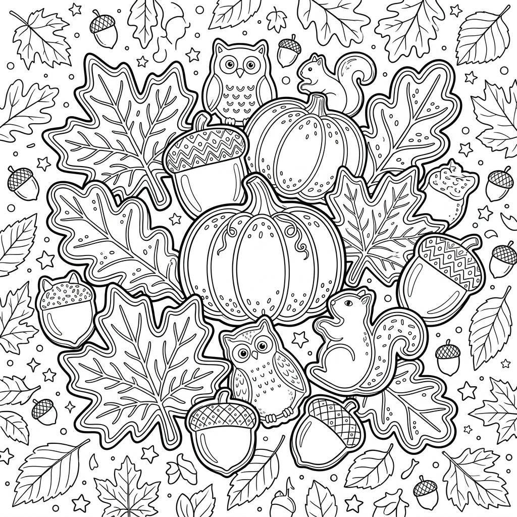 Dive into the festive spirit of autumn with this enchanting coloring page, showcasing a delightful array of sugar cookies. Each cookie is meticulously outlined, designed to resemble popular fall icons such as plump pumpkins, elegantly shaped maple and oak leaves, and charming acorns. You'll also discover adorable cookie cutouts of a friendly owl and a playful squirrel, all framed by smaller, scattered autumnal elements like tiny leaves, stars, and more acorns, creating a rich and immersive scene perfect for detailed coloring.