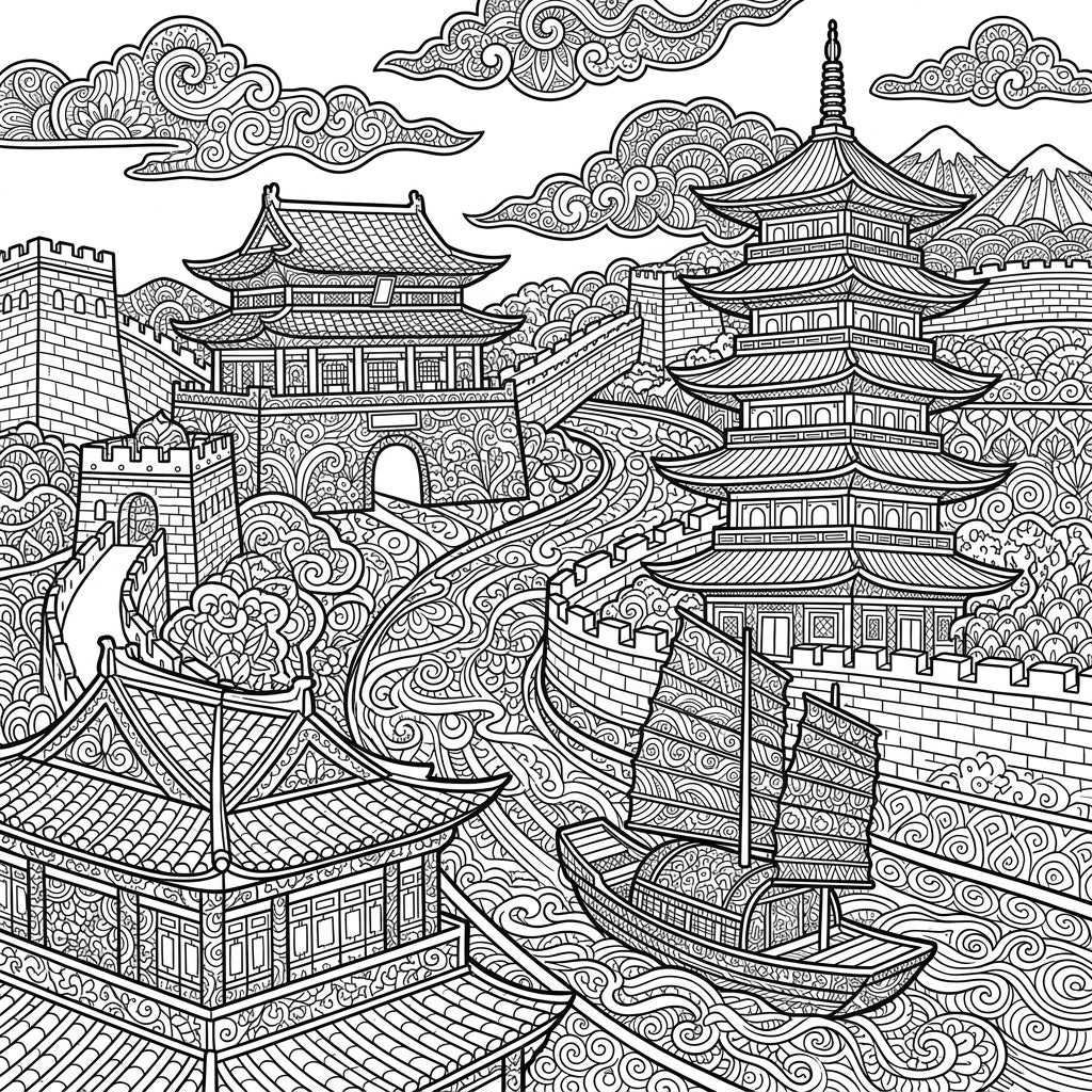 Embark on a visual journey to ancient China with this stunning Zentangle coloring page. This intricate design showcases a grand landscape inspired by the Sui Dynasty, featuring towering multi-tiered pagodas, a robust section of an ancient defensive wall complete with a majestic gate, and a traditional junk boat gracefully sailing on patterned waters. Lush, stylized mountains and swirling clouds, all adorned with exquisite Zentangle patterns, complete this detailed historical tableau, inviting you to explore every line and curve.