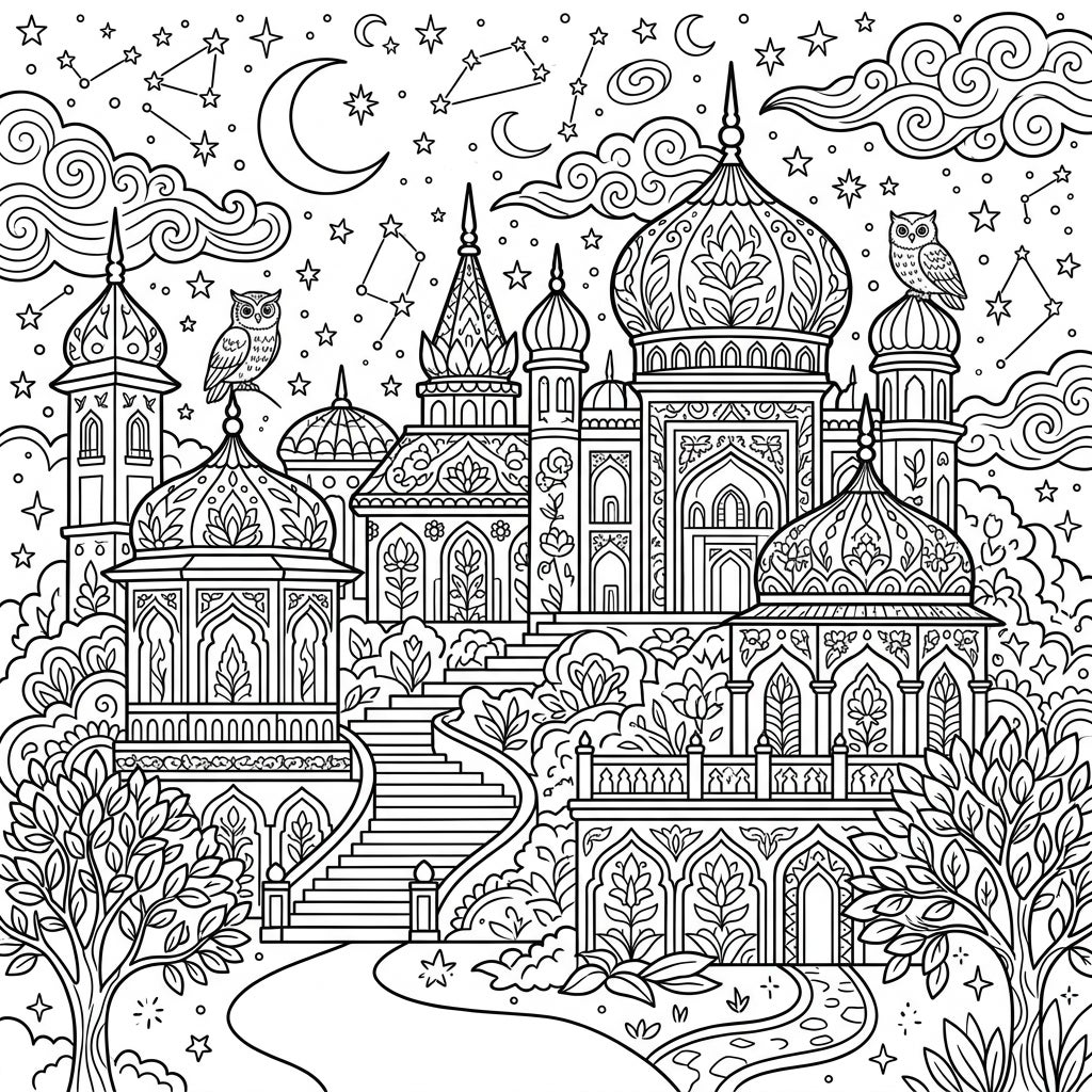 Journey to a fantastical summer palace bathed in the glow of a celestial night. This intricate coloring page invites you to bring a regal dreamscape, adorned with stars, moons, and wise owls, to vibrant life.