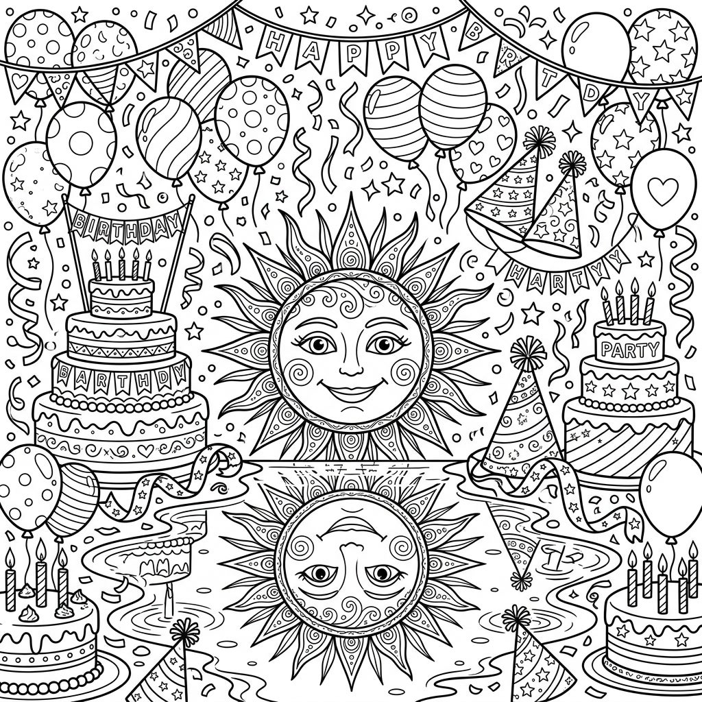 Step into a joyful celebration with this captivating coloring page that brings together the warmth of the sun and the excitement of a birthday party. At its heart, a cheerful sun, adorned with a happy face and swirling rays, presides over the festivities. Below, its perfect reflection dances on a rippling surface, adding a unique and artistic dimension to the scene. This intricate design is a tapestry of celebratory elements, inviting colorists to immerse themselves in a world of happiness and light.