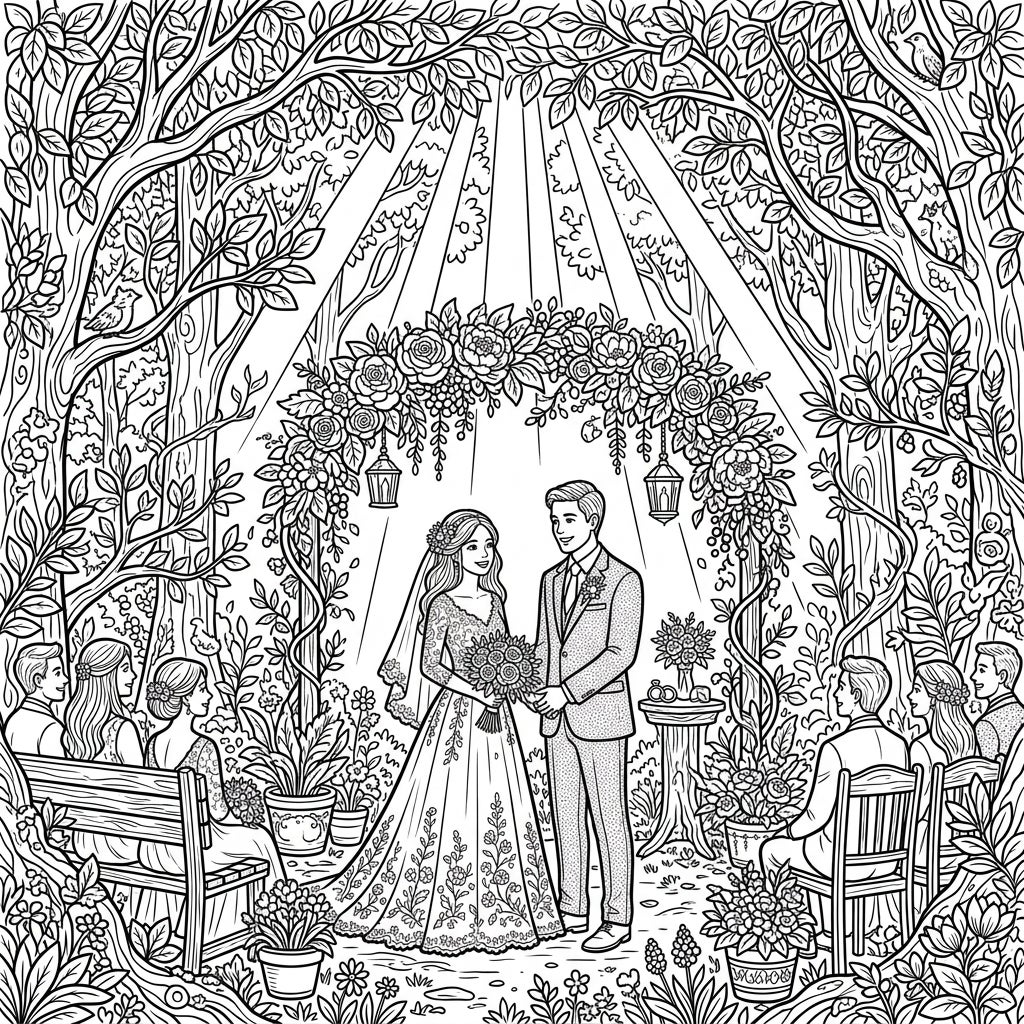 Step into a magical forest where love blossoms under a canopy of trees. This stunning coloring page captures the romantic essence of a wedding celebration illuminated by gentle sunbeams.
