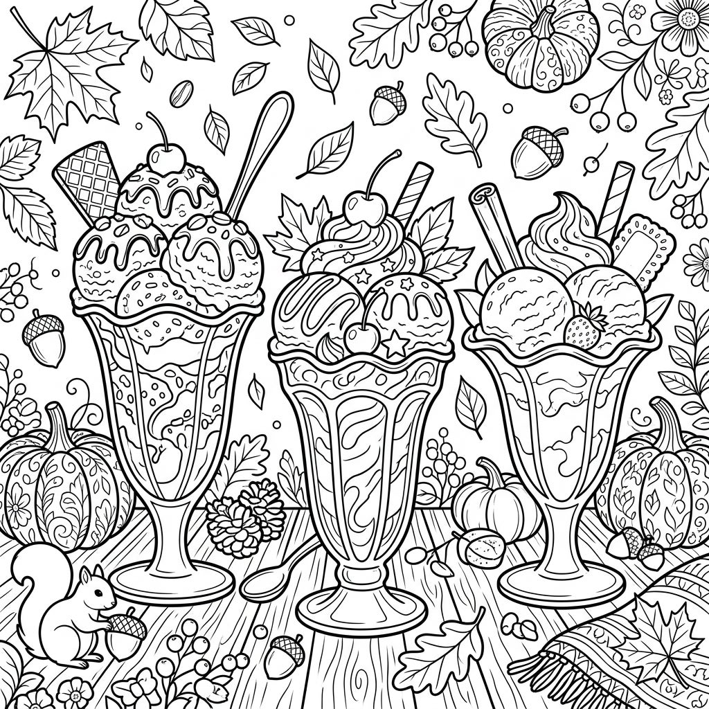 Dive into the cozy essence of fall with this charming coloring page, showcasing three decadent sundaes brimming with toppings. Surrounded by festive autumn leaves, pumpkins, and a playful squirrel, it's a perfect blend of sweet treats and seasonal charm.
