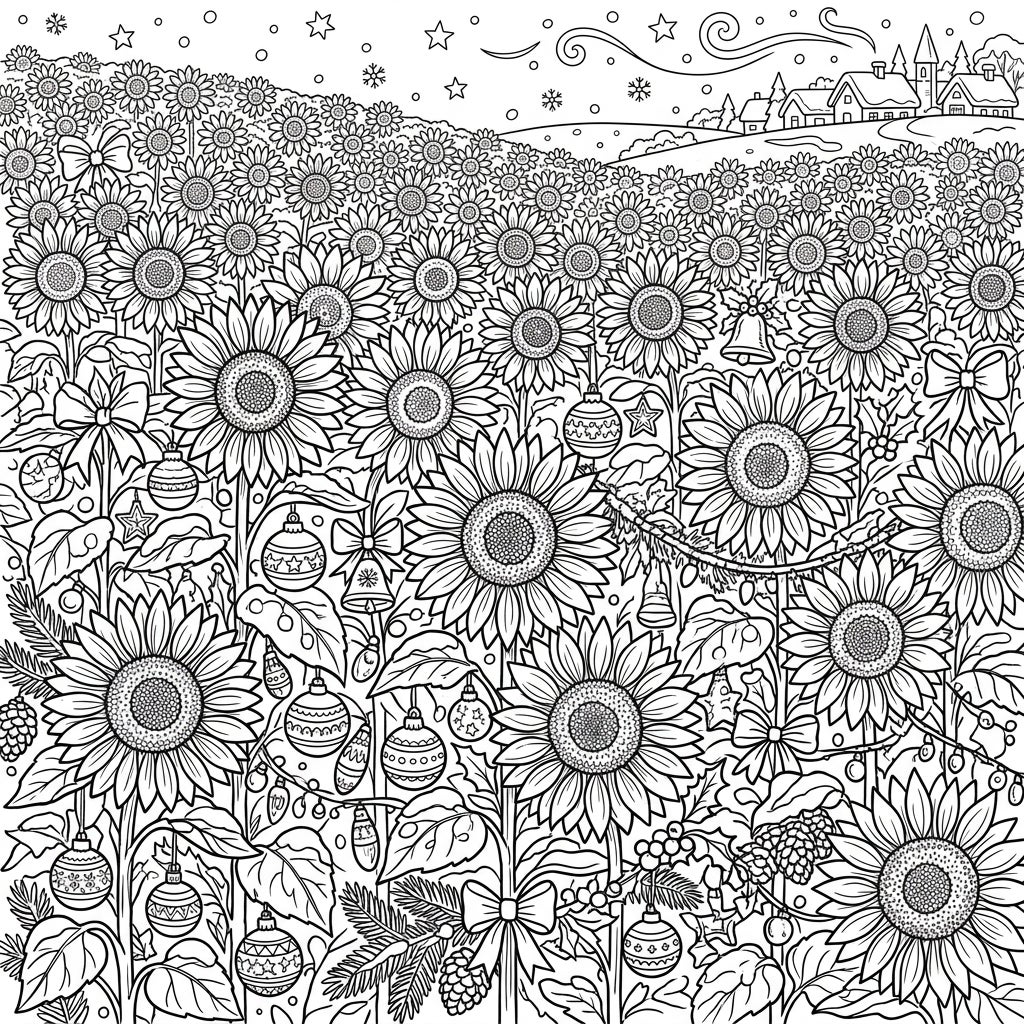 This intricate coloring page invites you to explore a breathtaking fusion of seasons, featuring expansive sunflower fields generously adorned with festive Christmas decorations. Each sunflower head is rendered with exquisite detail, its petals and central disk ready to burst with your chosen hues. Amidst the cheerful blooms, discover a charming array of holiday elements like glistening baubles, whimsical bells, elegant bows, lush pine branches, and twinkling string lights, all adding a layer of magical surprise to this unique landscape. In the distant background, a quaint village with snow-dusted roofs rests peacefully under a star-dotted, moonlit sky, complete with delicate snowflakes drifting down.