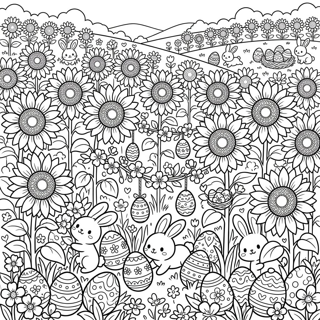 Immerse yourself in a joyful Easter scene amidst a vibrant sunflower field, bustling with adorable bunnies and charmingly decorated eggs. This detailed coloring page offers a delightful blend of spring's beauty and festive celebration.