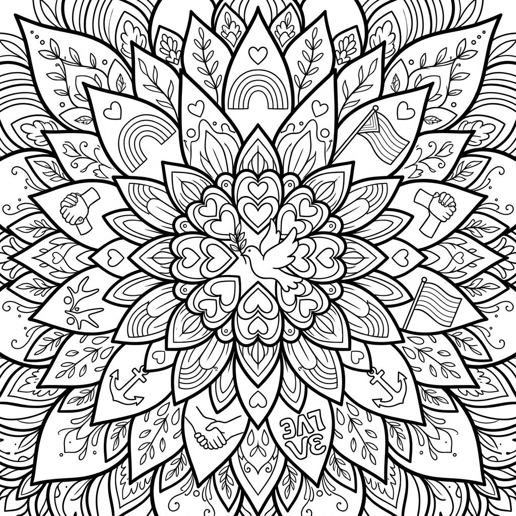 Dive into the heart of creativity with our Sunflower Mandala coloring page, a vibrant tribute to Pride Month. This radially symmetrical design unfurls like a majestic sunflower, with layers of intricately detailed petals. At its core, a peaceful dove cradles an olive branch, encircled by a ring of delicate hearts. Each subsequent layer of petals is adorned with meaningful symbols: joyous rainbows, hands clasped in unity, a raised fist signifying strength, anchors representing hope, proudly waving striped flags, and the word 'LVE' hinting at the universal message of love.