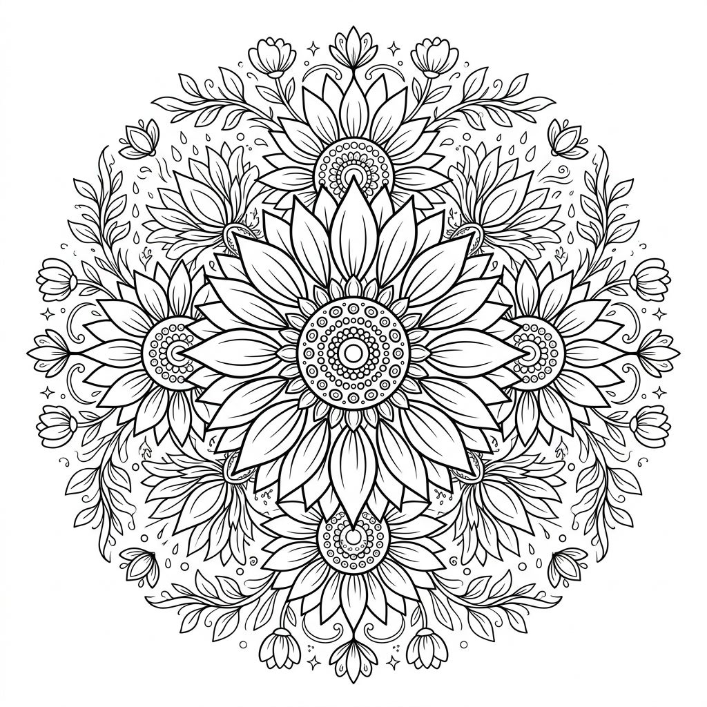 Dive into the intricate beauty of this sunflower mandala coloring page, a perfect blend of nature's majesty and calming artistry. The design features a magnificent central sunflower, its radiating petals and detailed seed head forming the heart of this symmetrical masterpiece. Surrounding it are smaller sunflowers, elegantly intertwined with graceful vines, budding flowers, and tiny decorative elements that invite a close look and thoughtful coloring.