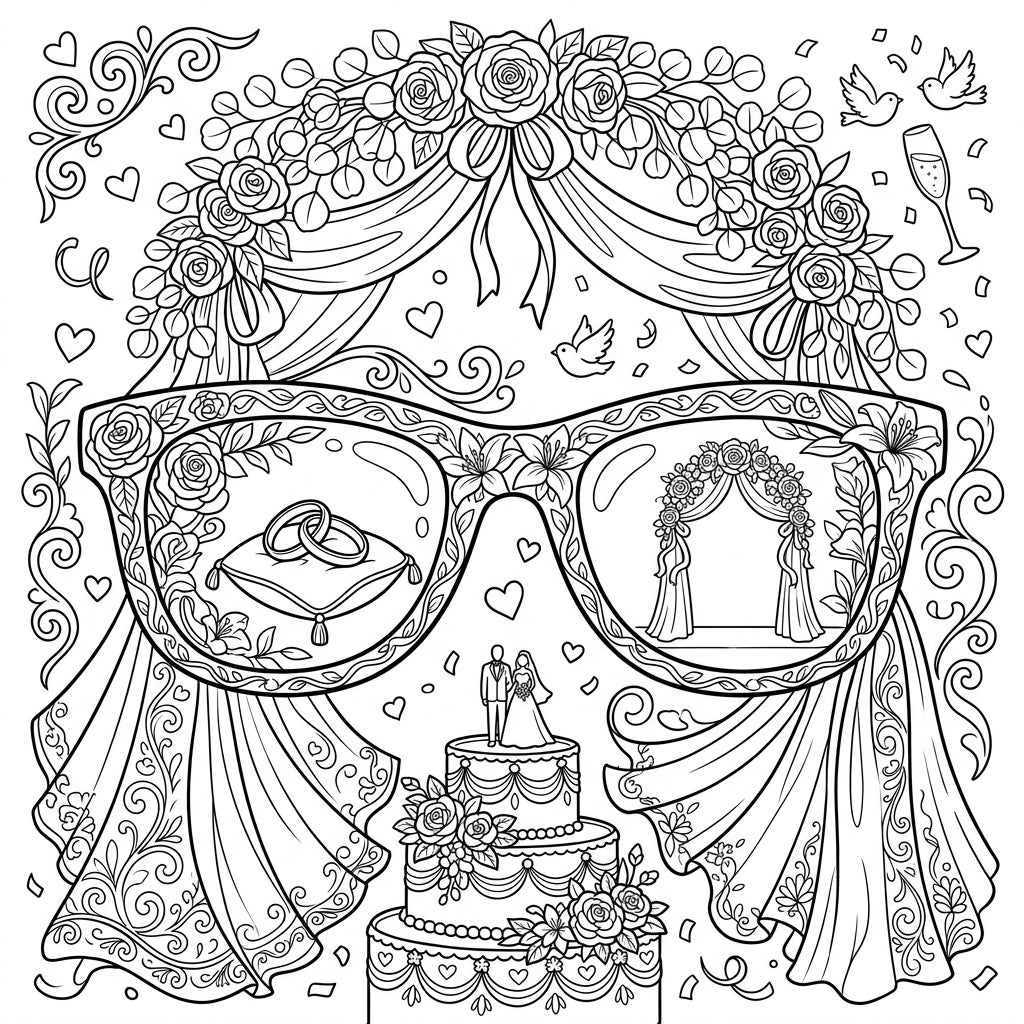 Discover a truly unique canvas with our 'Wedding Sunglasses' coloring page, where fashion meets celebration in exquisite detail. At its heart lies a beautifully adorned pair of sunglasses, whose lenses reflect cherished wedding moments: one showcasing a pair of intertwined wedding rings resting delicately on a cushion, and the other, a grand floral arch awaiting vows. The entire design is a tapestry of romance, framed by flowing drapes, lush floral garlands, a delightful multi-tiered wedding cake topped with a loving couple, and whimsical accents like scattered hearts, flying doves, and confetti.