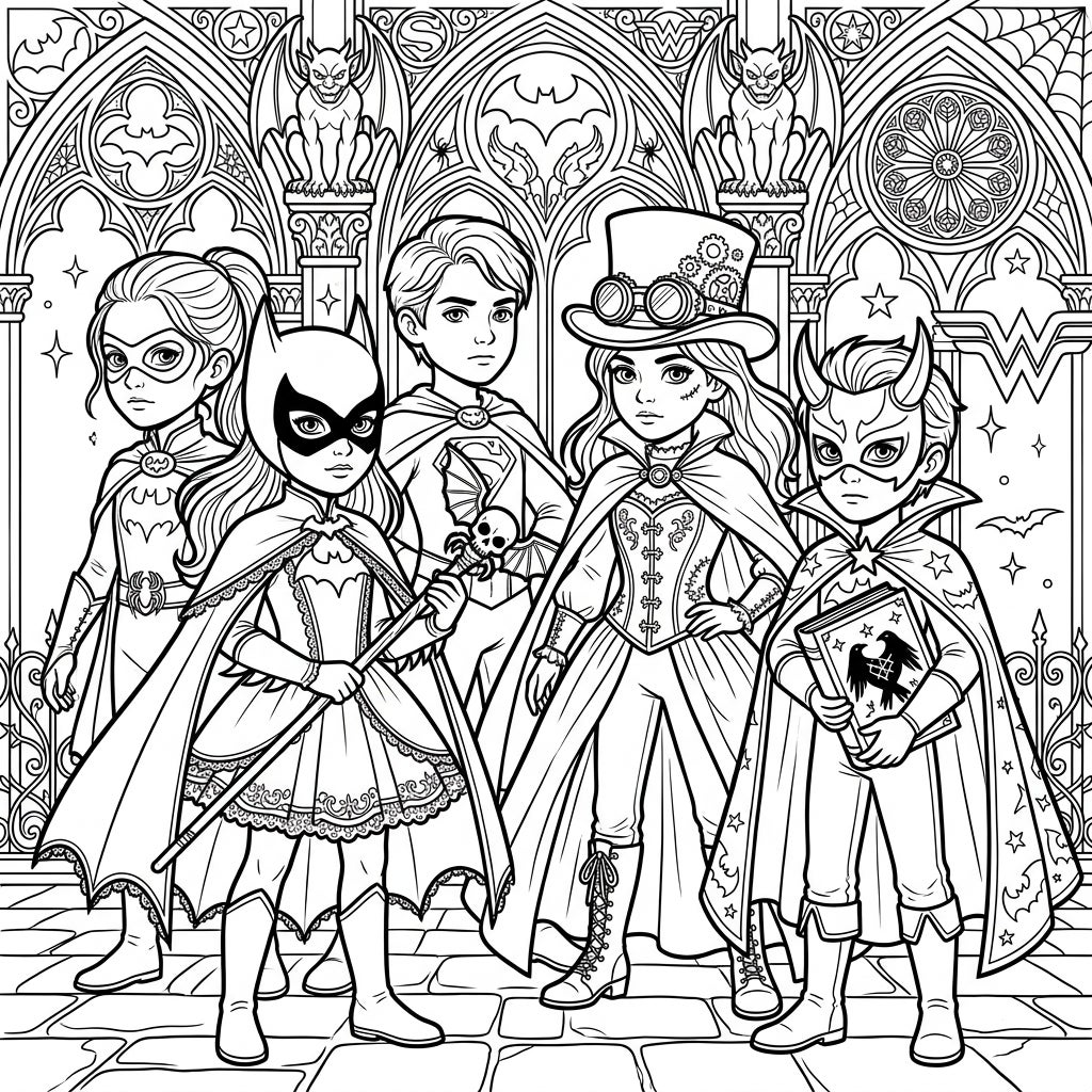 Step into a world where courage meets the captivating allure of the dark with this intricate coloring template. This scene brings together five young heroes, each adorned in unique superhero attire fused with distinct gothic elements. Observe the capes and masks, lace details, top hats with gears, and even a skull-topped staff, all set against a backdrop of grand gothic architecture, complete with ornate arches, fierce gargoyles, a detailed rose window, and subtle superhero insignia woven into the design.